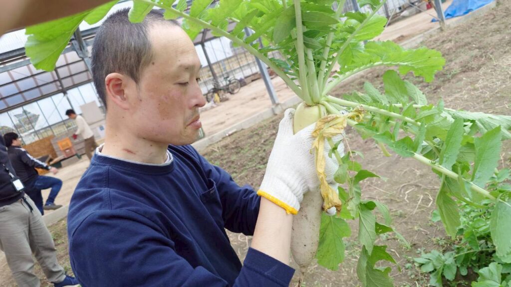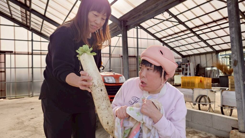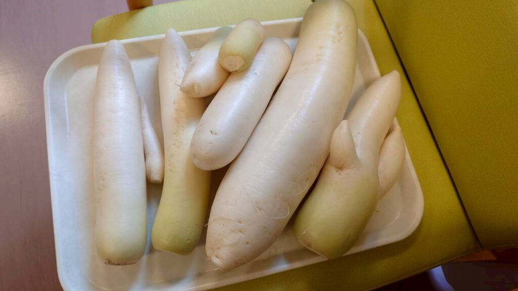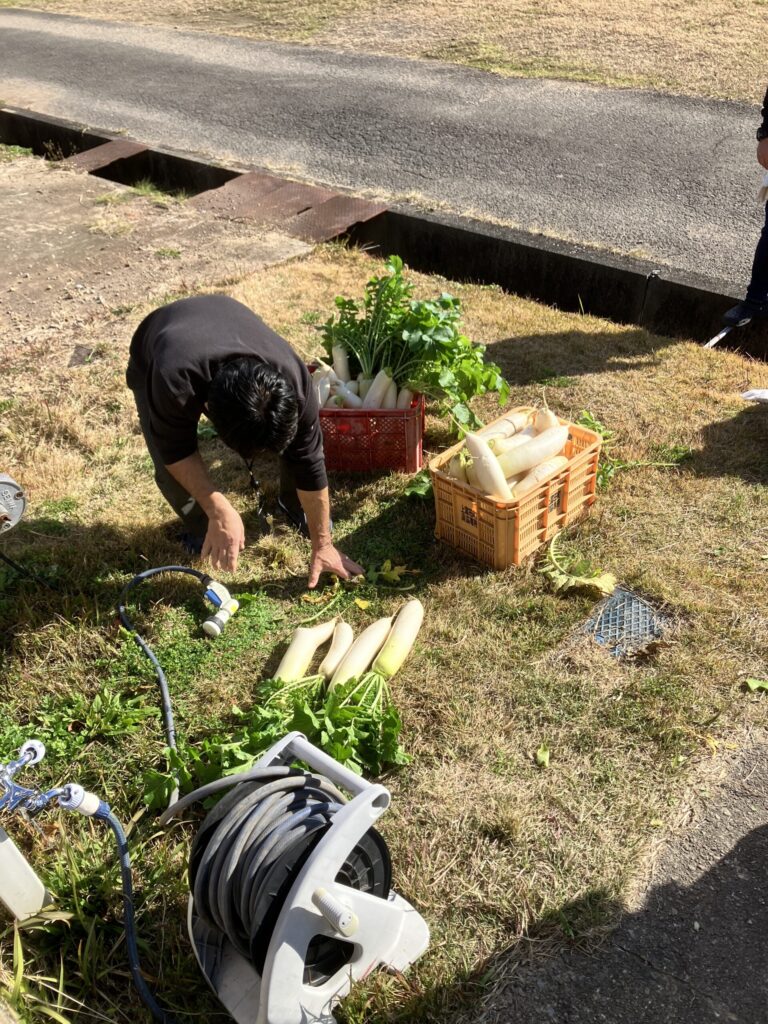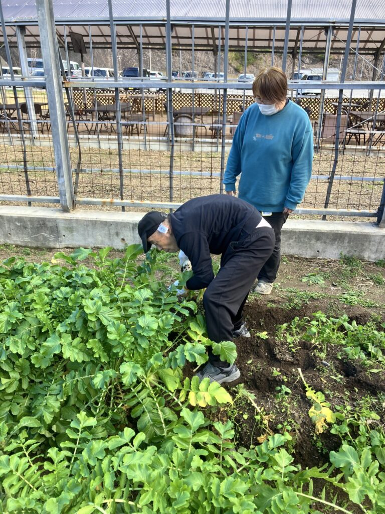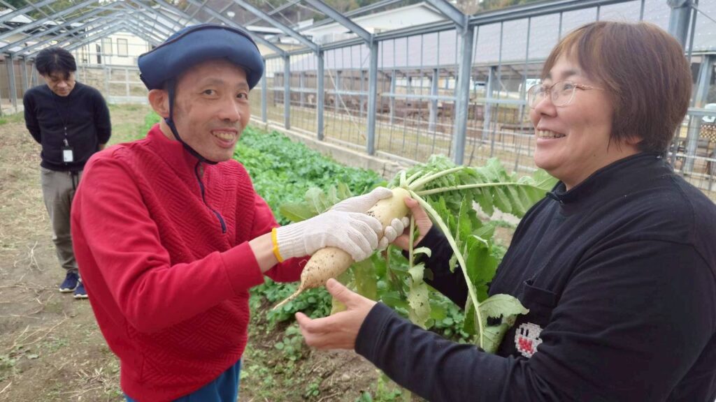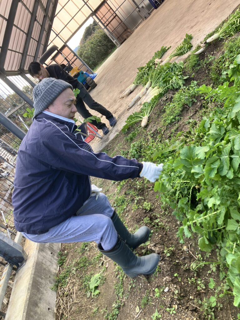 令和7年12月 大根収穫 2026年1月30日2026年2月7日 あすなろ花卉の郷 畑で栽培していた大根を12月に収穫しました。年末の帰省日に自宅に持ち帰ってもらったり、ユニットで切り干し大根、大根煮、みそ汁、お浸しなど作り食べています。作る喜び、食べる喜び、嬉しさも倍増です。 もみのきユニットは収穫した大根で、切り干し大根を作っています。 大根を煮込んで、お節料理に一品追加していただきました。 URL Copied!