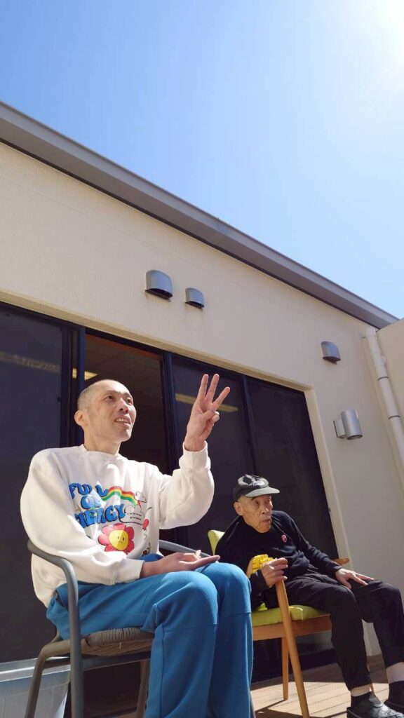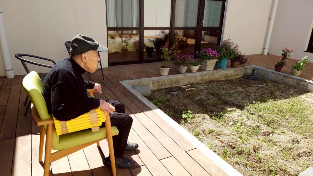 3月11日はぽかぽか陽気でした。もみのき、ひのきユニットの間の中庭で日向ぼっこされる利用者様。