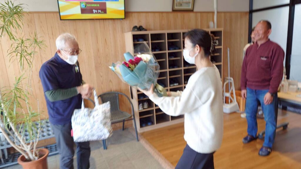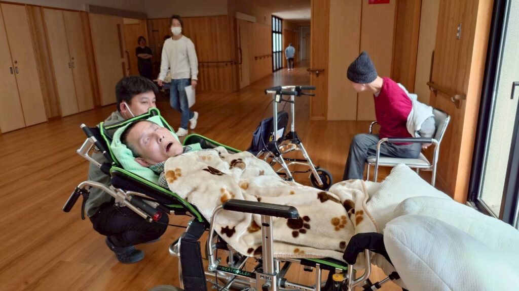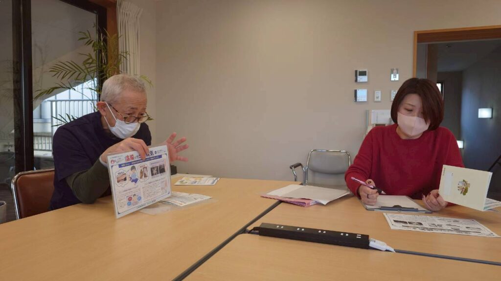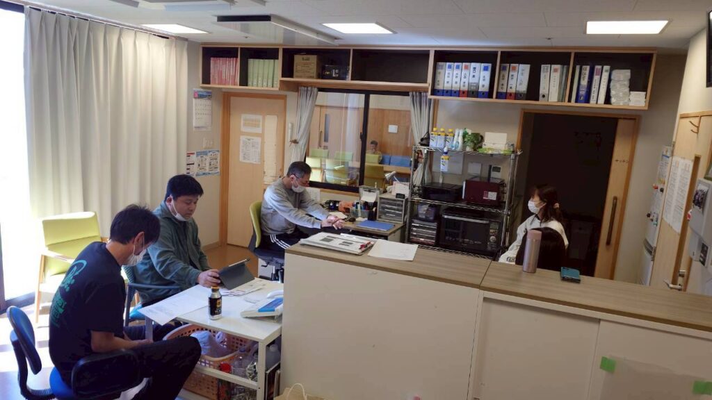 3月11日には利用者様の内科健康相談がありました。嘱託医の丸岡ドクターが今回で退任となり、令和8年度から嘱託医となる岩畔ドクターと引継ぎしながらの、往診となっています。写真は、医務室前で順番を待たれる利用者様のご様子です。