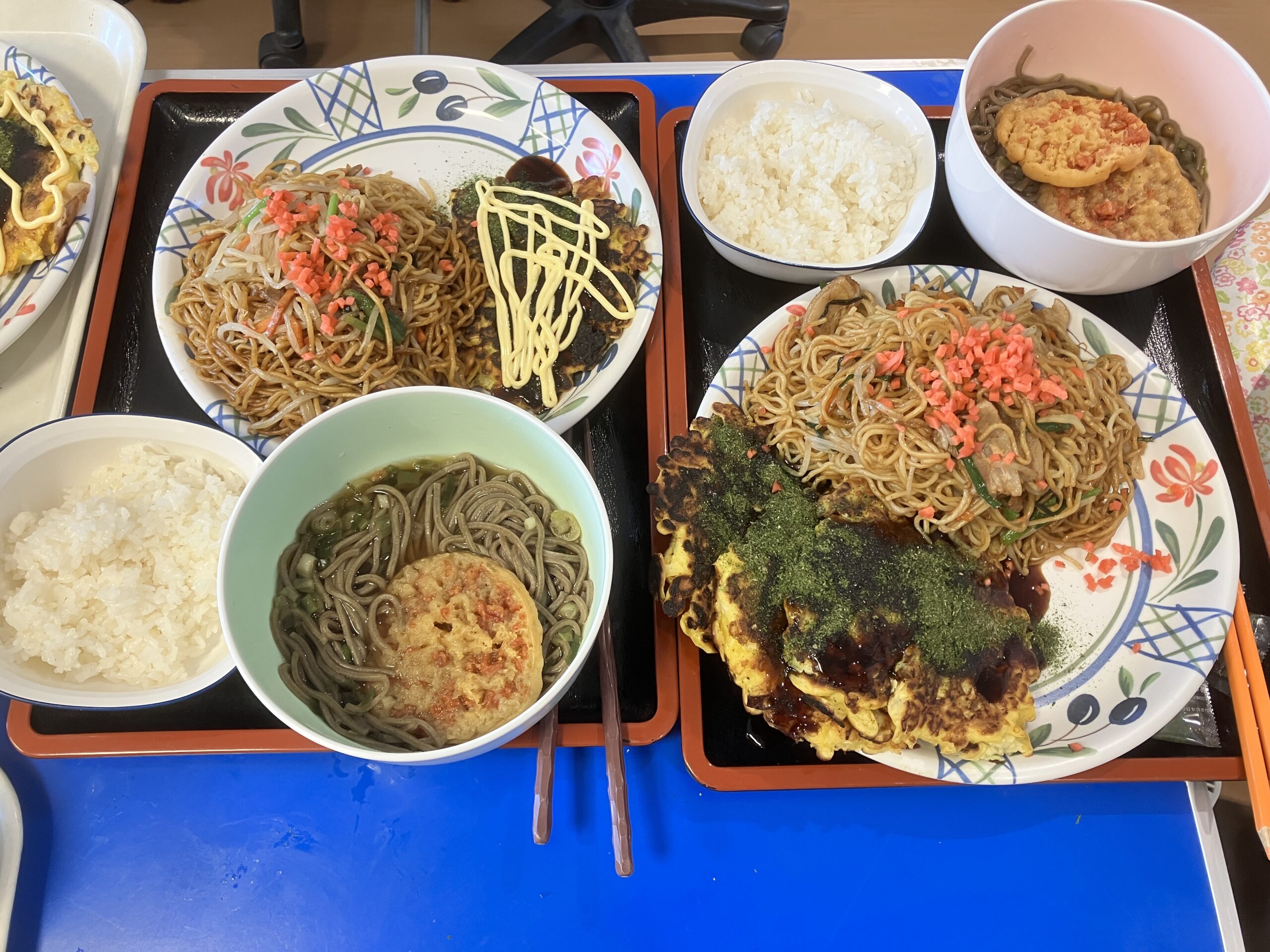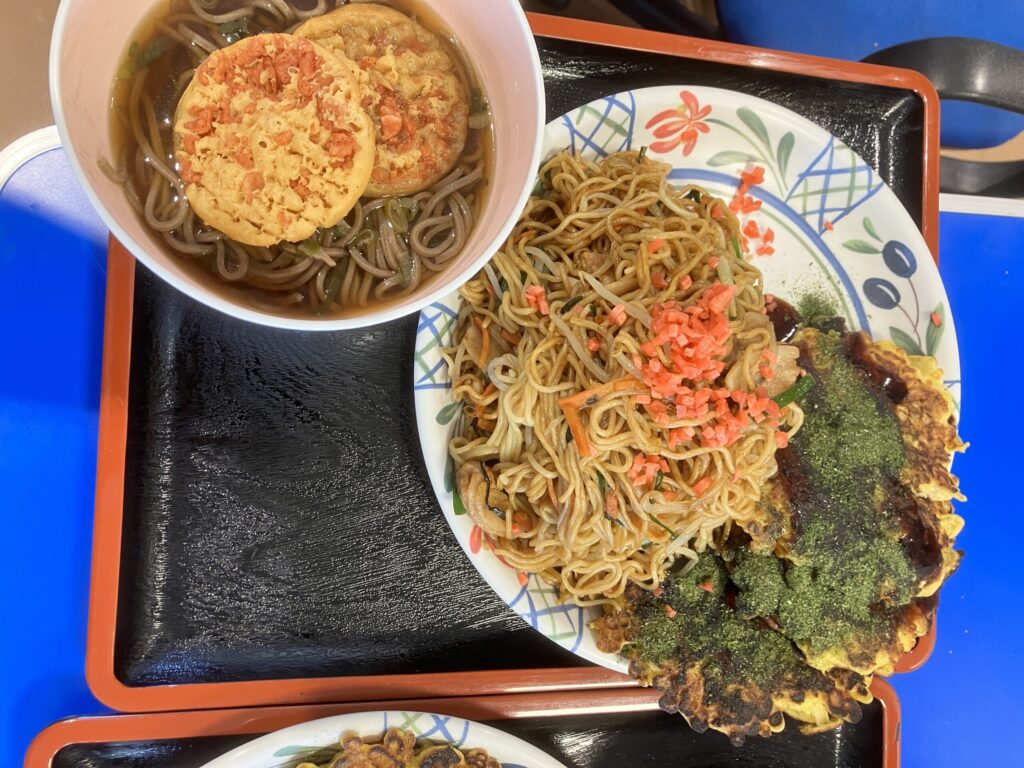 お好み焼き、焼きそば、ごはん、天ぷらそば