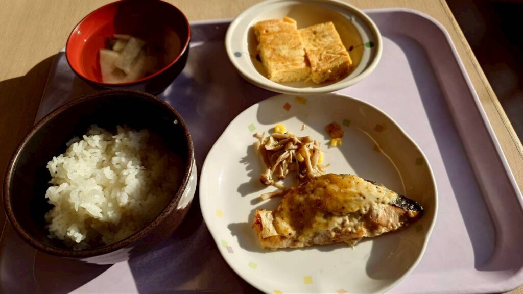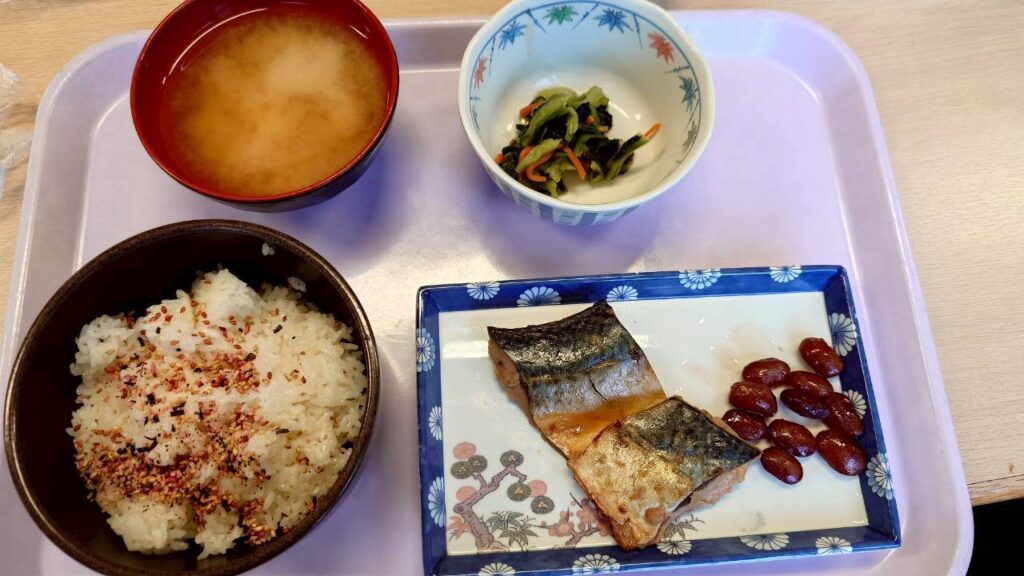 3月23日 朝食。朝「ごはん食」の日。ごはん、ふりかけ、サバの照り焼き、小松菜のおひたし、みそ汁(さつま芋)