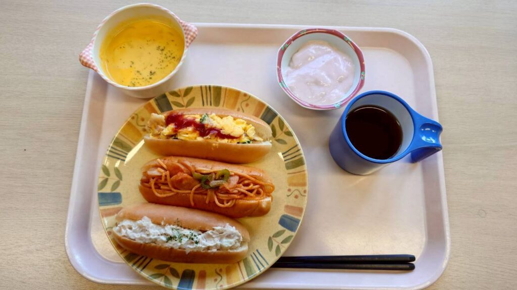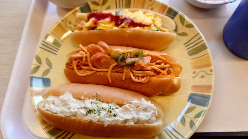 ホットドッグは、ツナ、ナポリタン、ベーコンたまごの3種類。