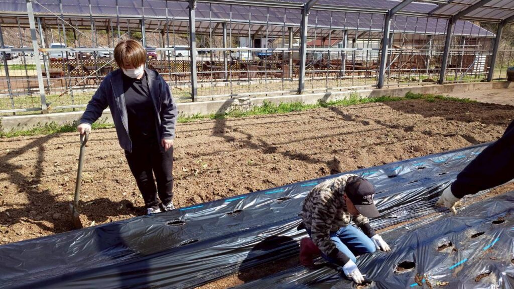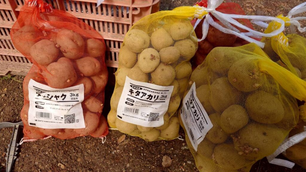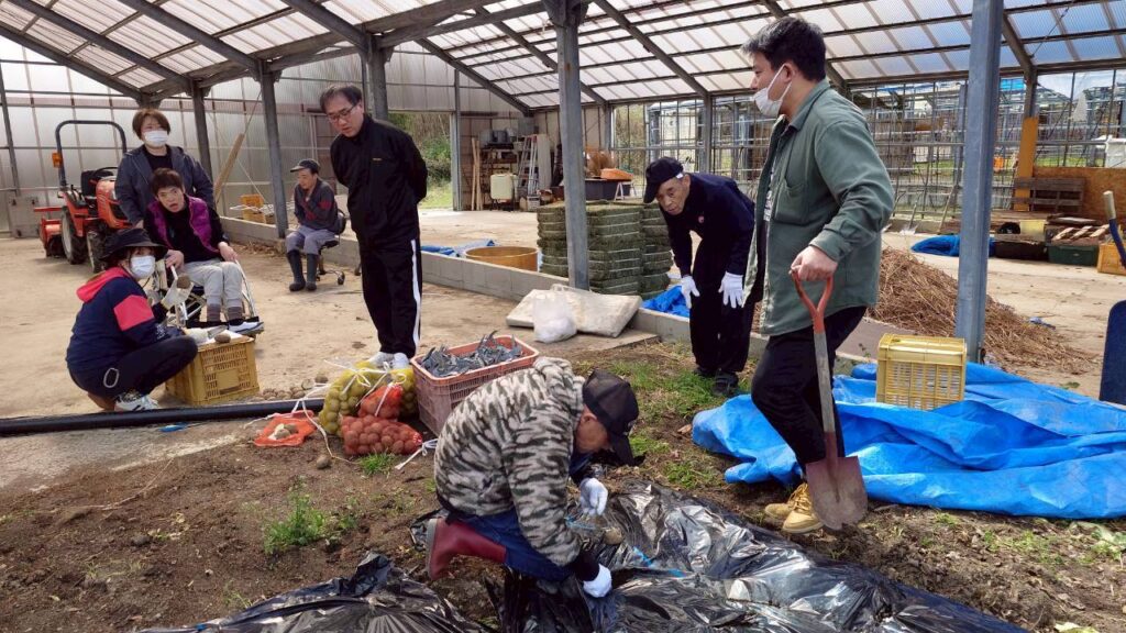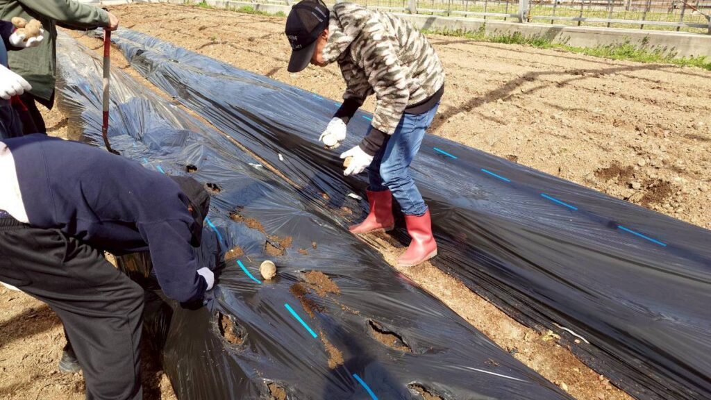 ジャガイモを包丁で切るグループ、スコップでマルチシートに切れ目を入れるグループ、種芋を並べていくグループ、種芋を植え付けていくグループ、役割分担して頑張りました。