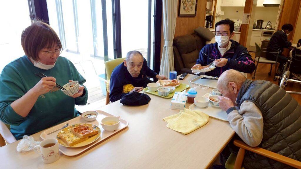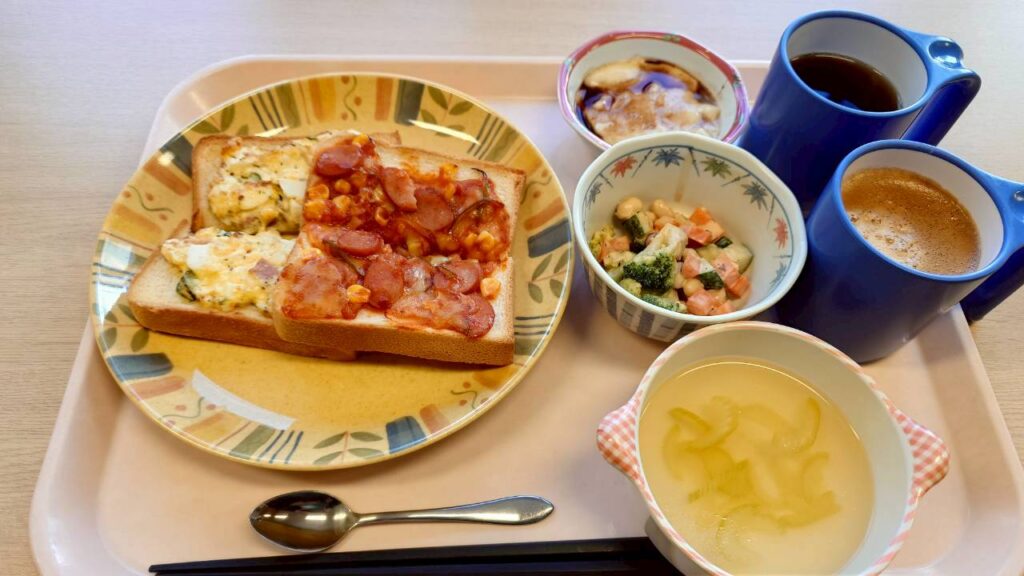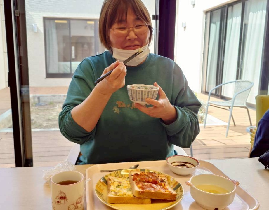 令和8年3月9日 パン食も美味しい花卉の郷 2026年3月9日 あすなろ花卉の郷 3月9日の昼食。ピザトースト(トマトソース)、ピザトースト(たまご)、ビーンズサラダ、コンソメスープ(セロリ)、デザートプリン(チョコソース)。朝食が「ごはん食」の日は、昼食献立が「パン食」になります。 ひのきユニットの昼食の様子。 家族団らんといった趣で、わいわい楽しいランチタイム。 家族がパン屋で「パンにはちょっとうるさいで」という職員からも「美味しいわ」とスマイルで高評価いただきました。 URL Copied!
