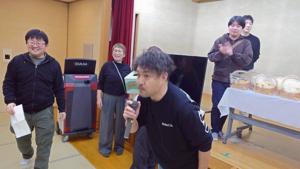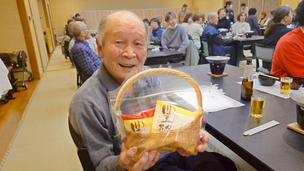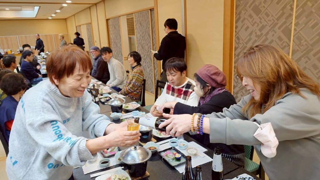 宴会には、業務を終えた職員や、休みの夜勤支援員らも合流して団らん。