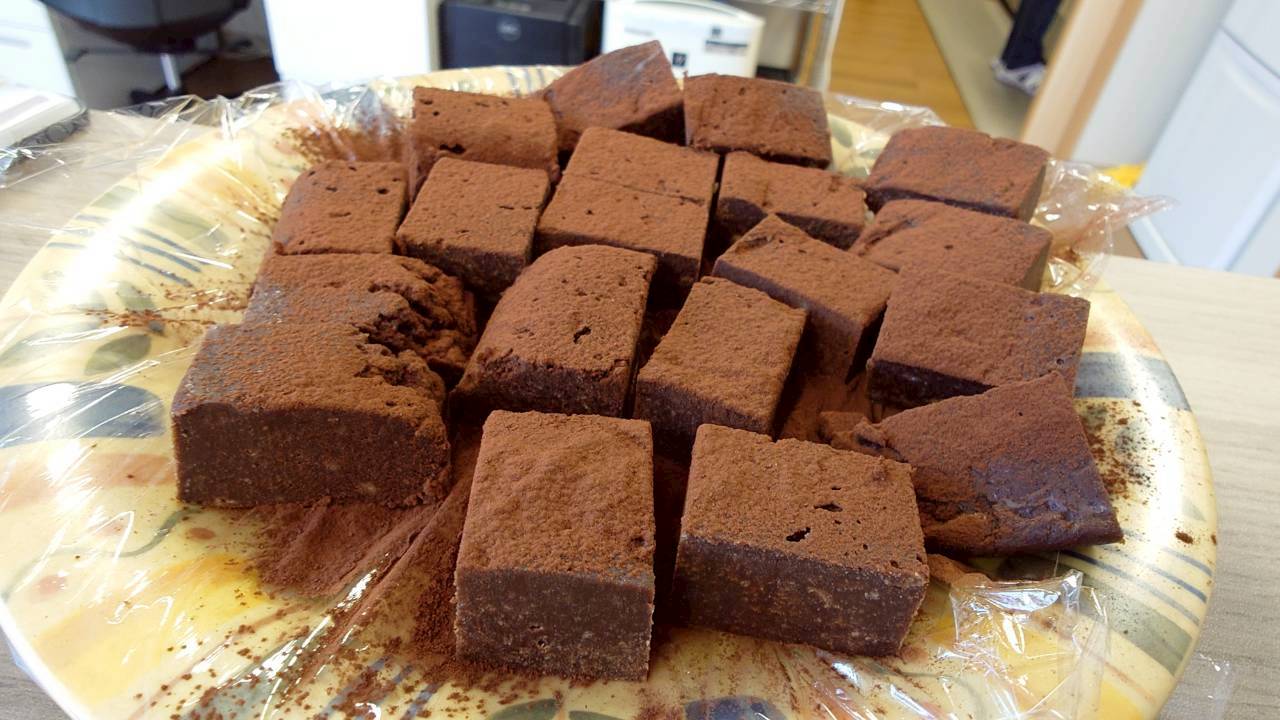 チョコパイを溶かして、チョコを少し追いたして再成型。ココアパウダーをまぶして出来上がり。濃厚です。