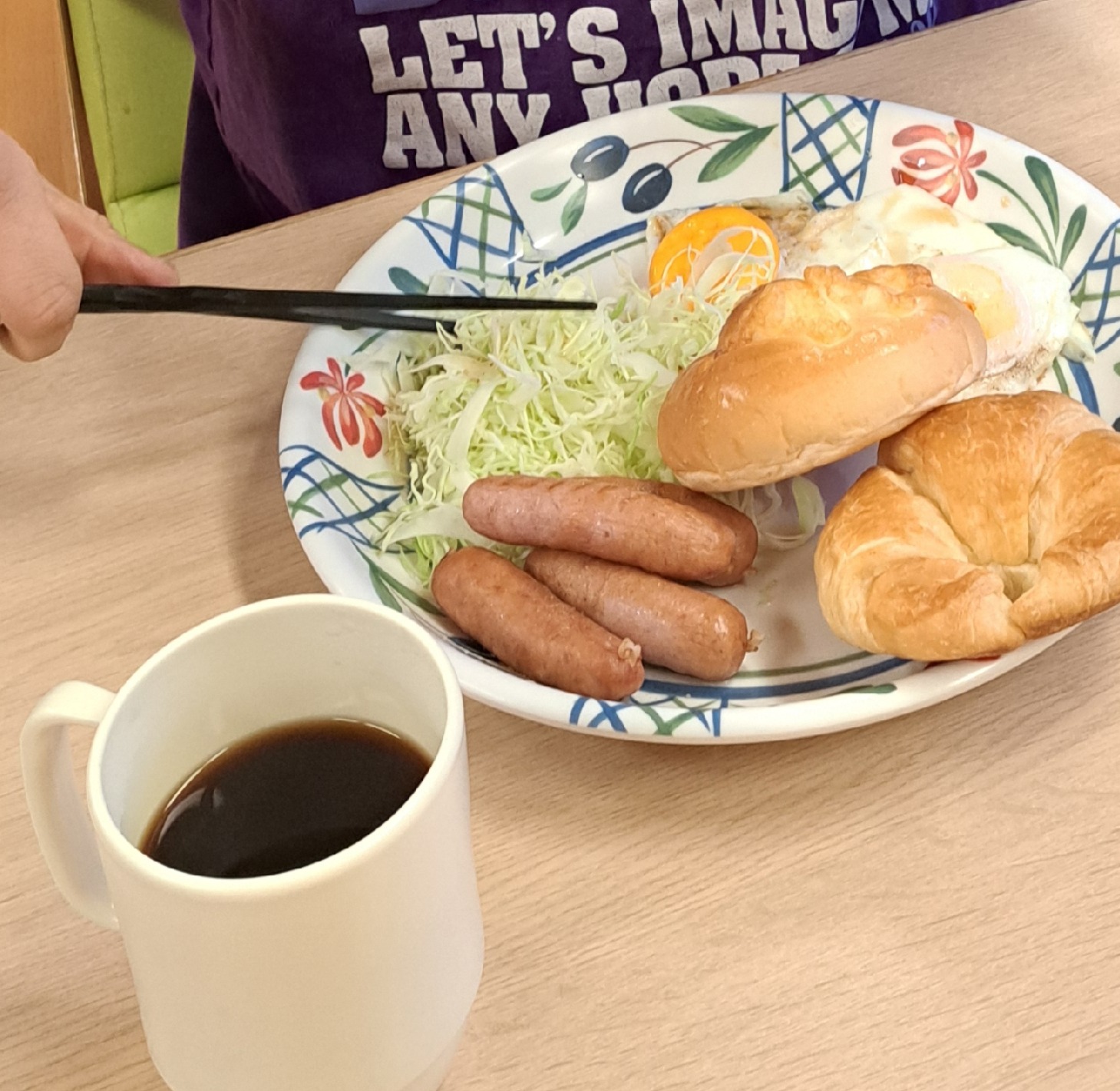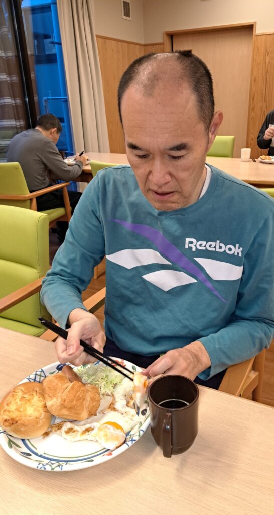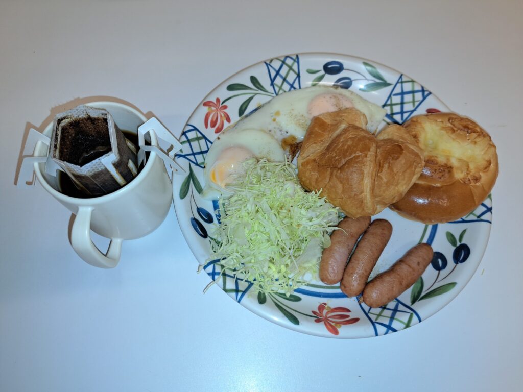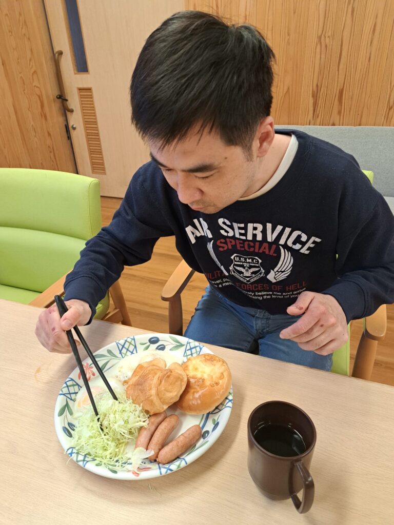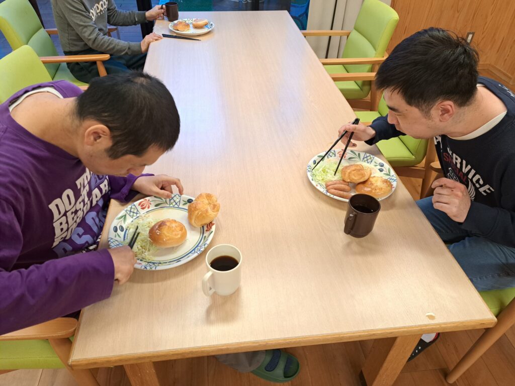 2月17日のけやきユニットの朝食。実費にはなりますが、ウインナーを焼いて、キャベツを添えて、目玉焼きを焼いて、みんな好きなパンを用意して、モーニング。