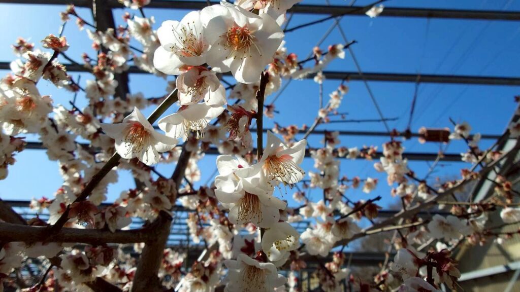 花卉の郷の梅の開花状況。大分、散ってきましたが、まだ綺麗に咲いている梅もあります。