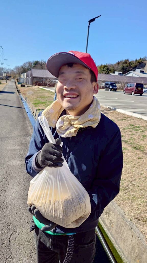 鶏の餌を、ひのきユニットで飼育している鶏用に準備してくれた利用者様。いい笑顔ですね。
