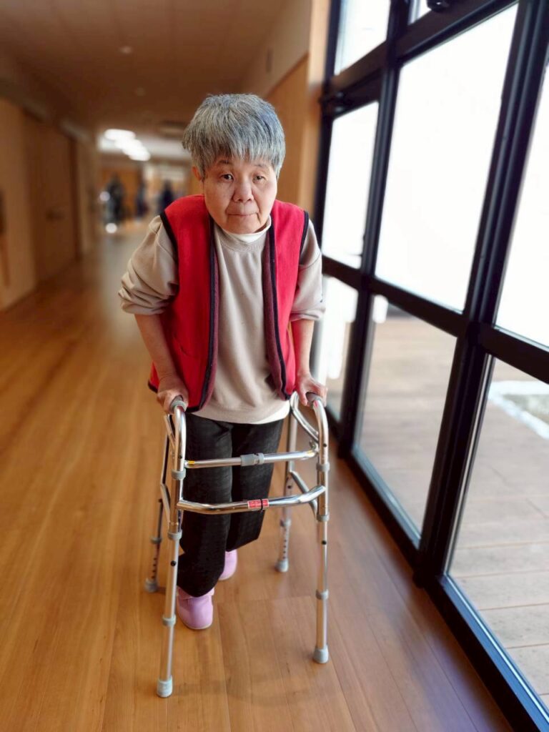 歩行器を使って、室内歩行に取り組くまれる利用者様。頑張ってますね。