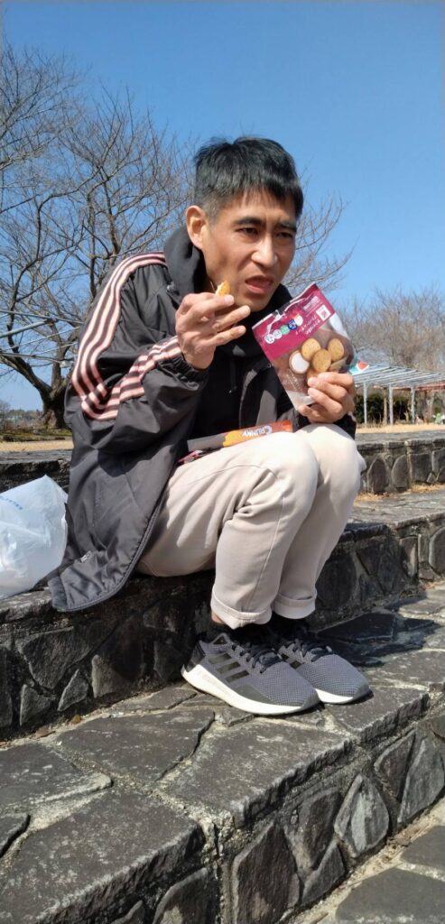 ポカポカ陽気の彦五郎公園で、購入したお菓子類をいただきました。