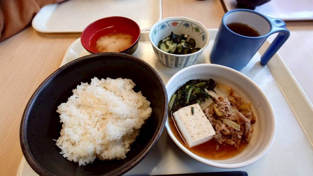 2月24日の昼食 ごはん、すき焼き風、酢の物、みそ汁(さつま芋)