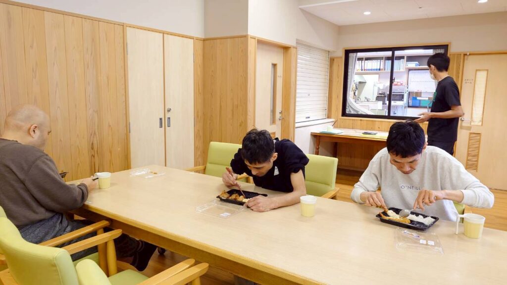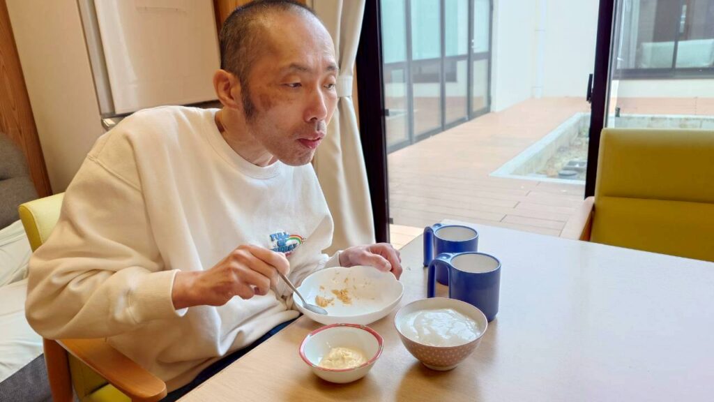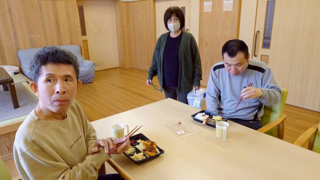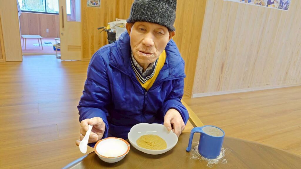 ミキサー食が必要な利用者様には、焼肉弁当を職員がミキサーにかけて、器にうつして食べてもらっています。