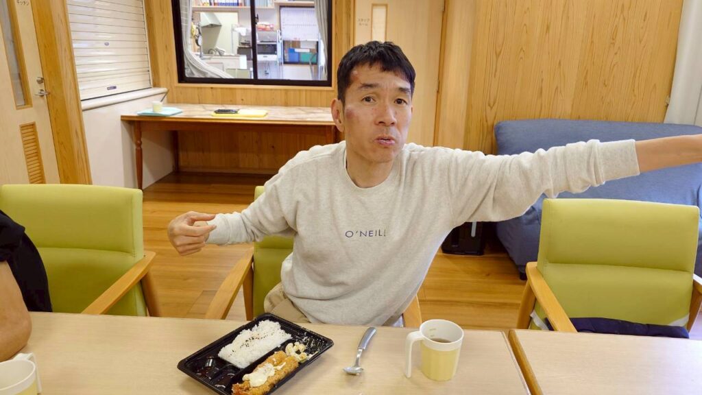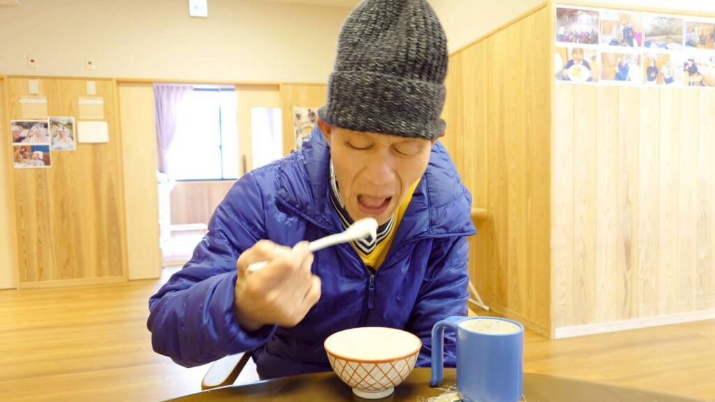 ミキサー食は、提供直前にブログ担当者も検食、味見させてもらっていますが、しっかりとした味付け、見た目以外は何ら変わらぬ焼肉弁当です。職員が献立を説明して、味わってもらっています。