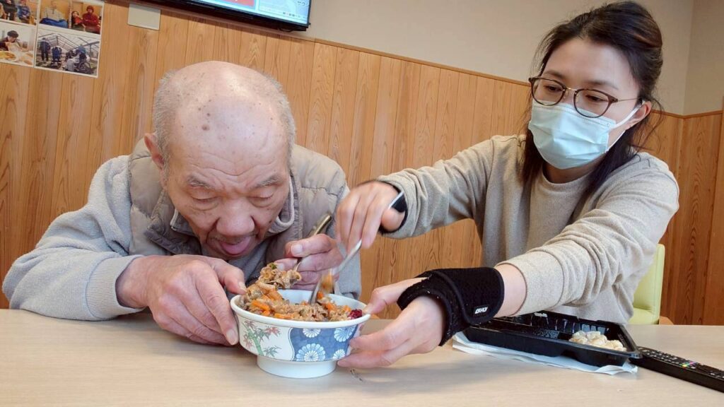 焼肉弁当を食べやすい器に移して、焼肉丼にして食べられる利用者様。