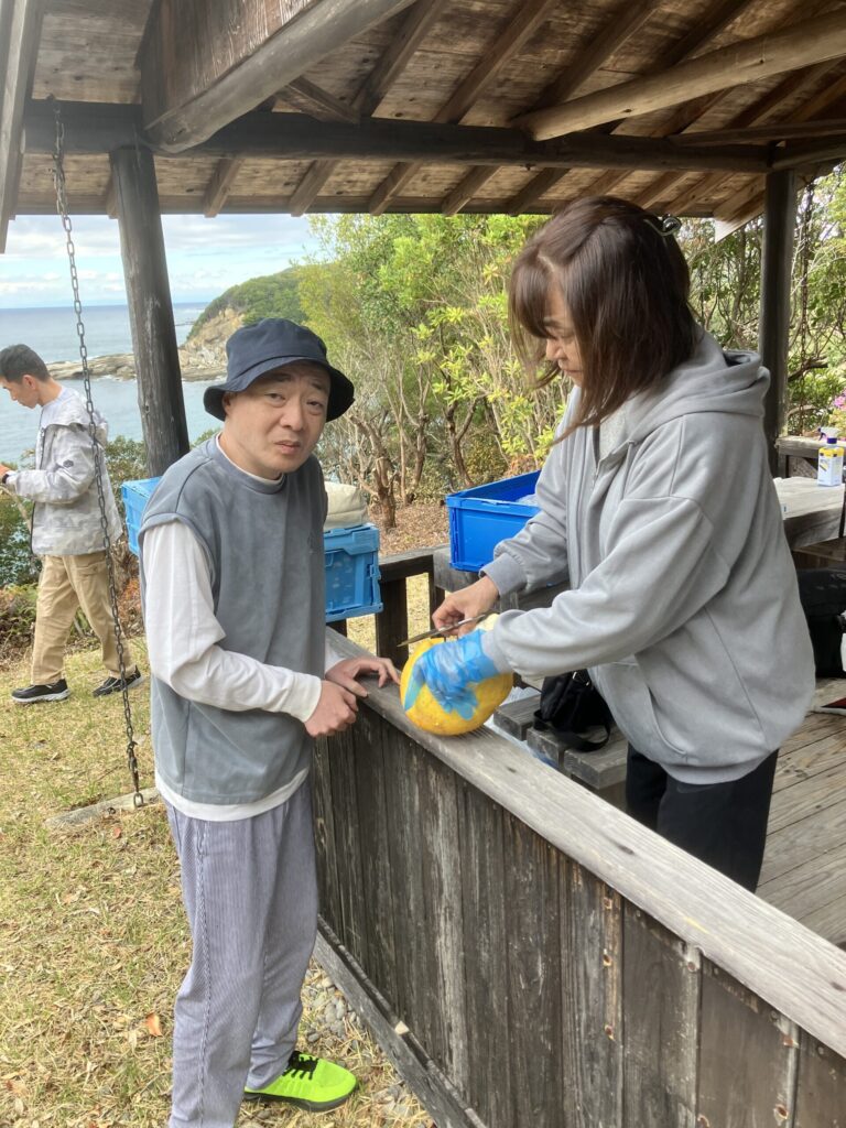職員がキッチンばさみで剝くことに。
