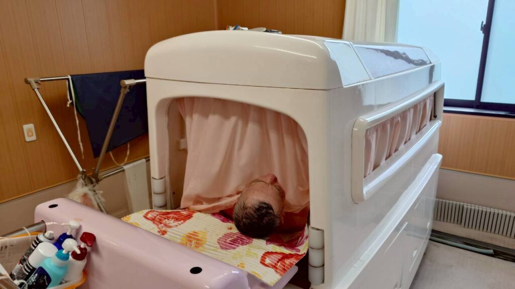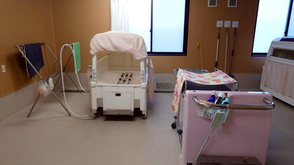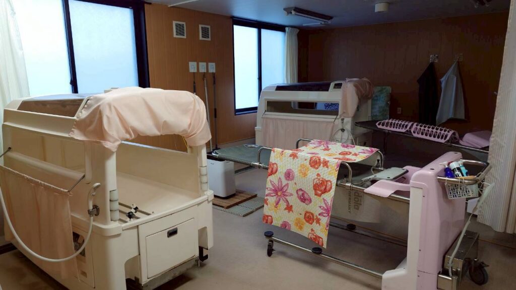 特殊浴室内の様子。特殊浴の機会は2台あって、この時は仕切りを外している時間帯ですが、現在は主にひのきユニットの利用者様とさくらユニットの利用者様が使用しています。