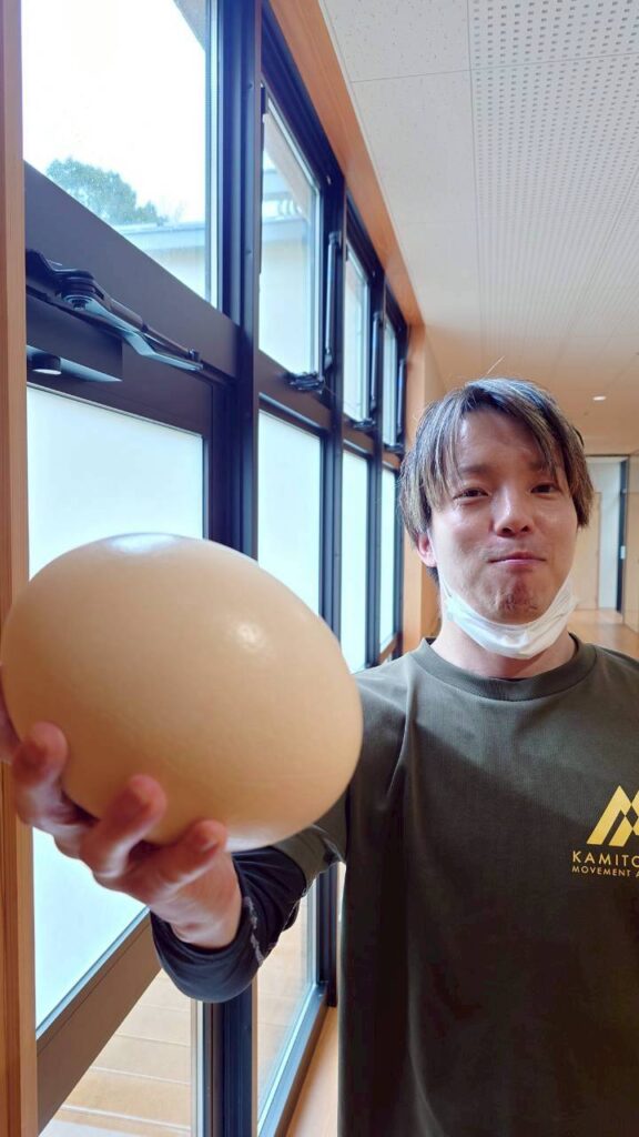 ダチョウが連日卵を産んでいます。今日は、つばきユニットの主任が購入してくれました。ありがとうございます。写真撮影の際のみ、せっかくなのでマスクを外してもらっています。