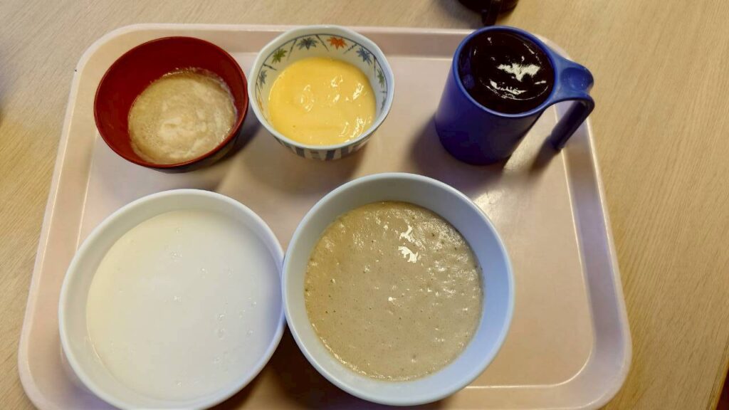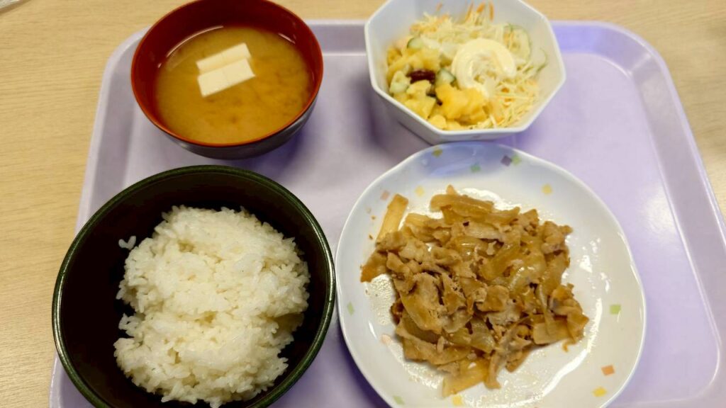 2月3日の夕食。ごはん、豚肉の生姜焼き、さつまいものサラダ、キャベツの千切り、みそ汁(豆腐)でした。