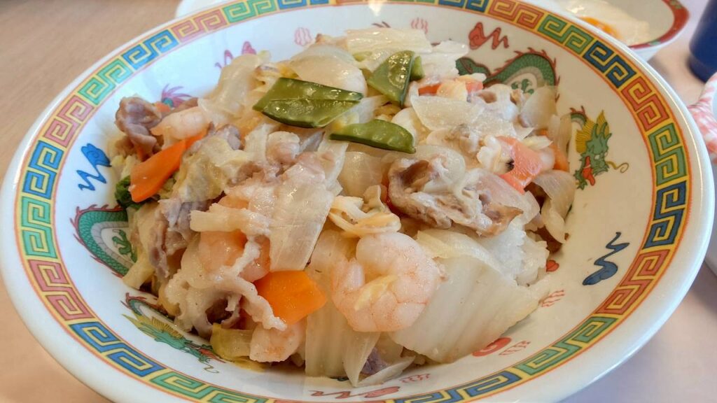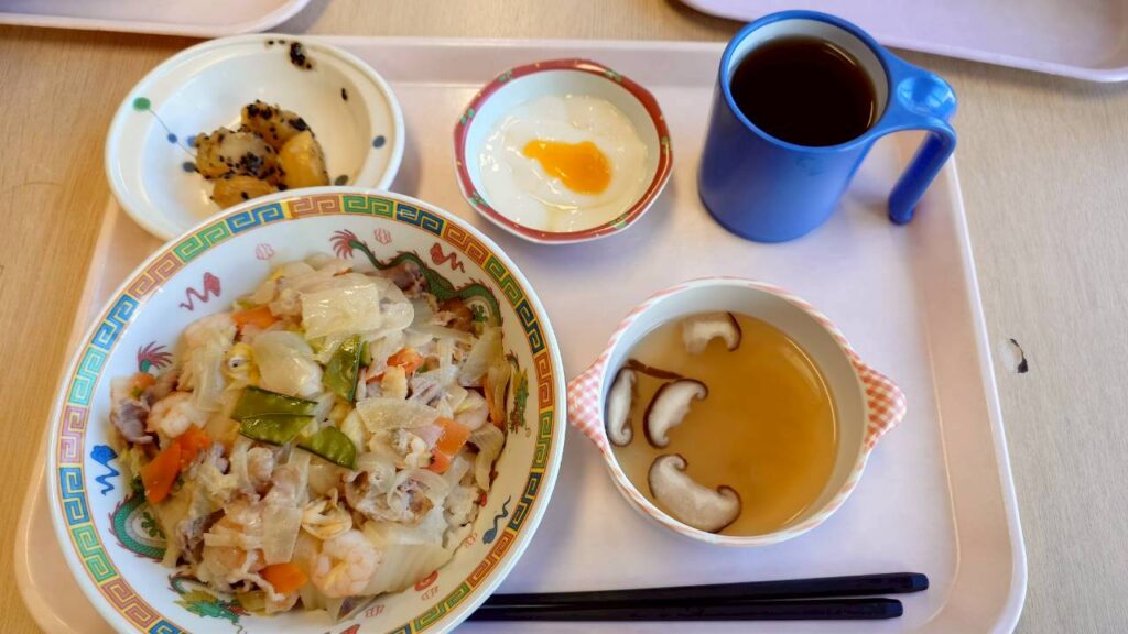 2月18日昼食。中華丼、大学芋、中華スープ、杏仁豆腐 マンゴーソース。