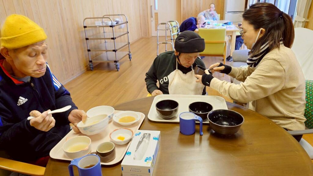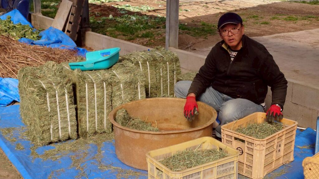 動物の餌用事にチモシーをほぐす作業の利用者様。