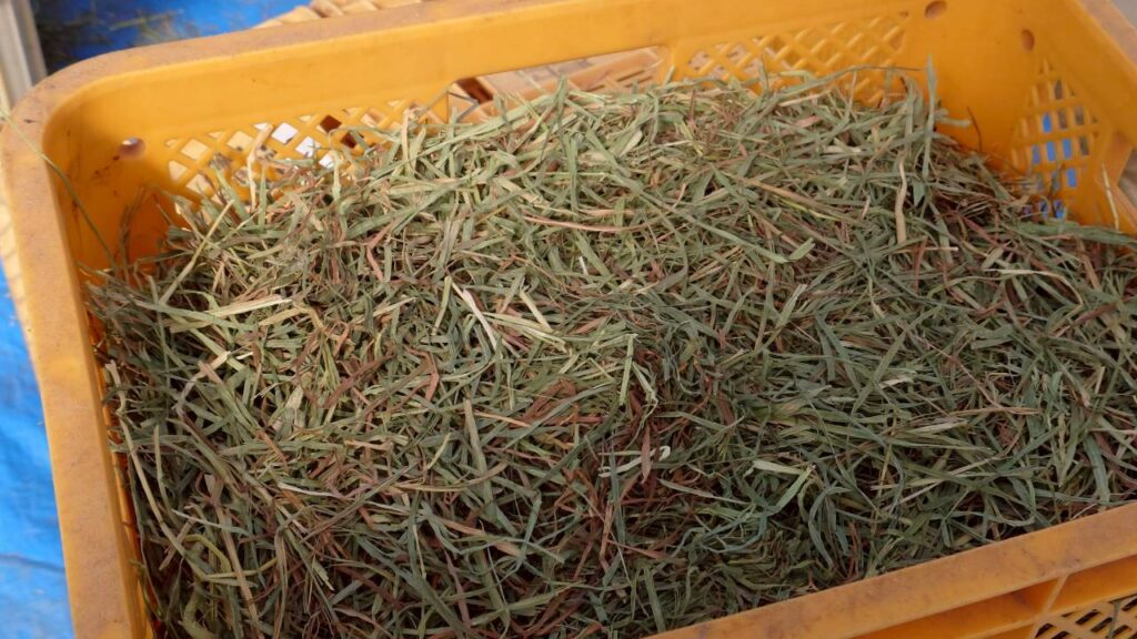動物が食べやすいように、またいつでもすぐに給餌できるように、ほぐしたチモシーをコンテナに入れて準備しています。
