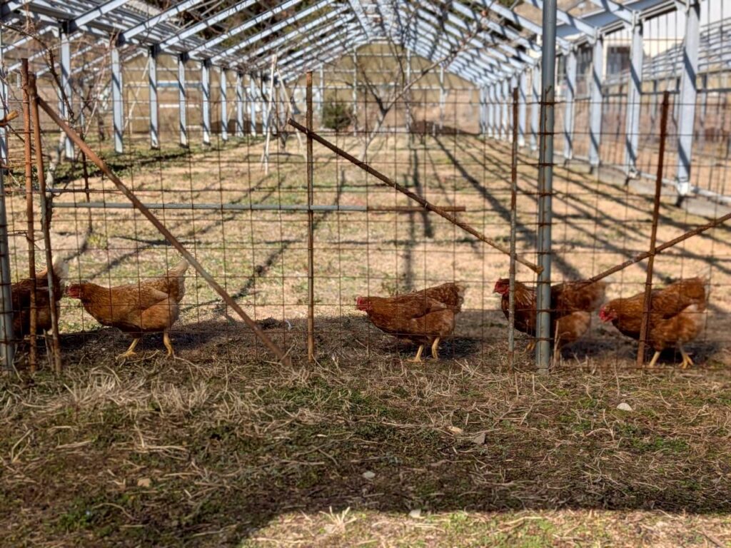 養鶏。鶏も自然の中でのびのび駆け回っています。