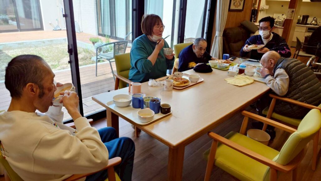 3月8日の夕食。ごはん、鶏肉のごま焼き、付け合せ いんげんのソテー、ひじきと大豆の煮物、赤だし(里芋) すぎのきユニットの夕食の様子。 すぎのきユニットは、午前…