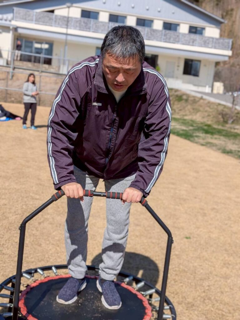 2月18日 午後からの活動の様子。新たな遊具としてトランポリンを導入しています。 天気がいいので、芝生で遊具を使ったり、日向ぼっこしています。 ハウス内の椅子も…