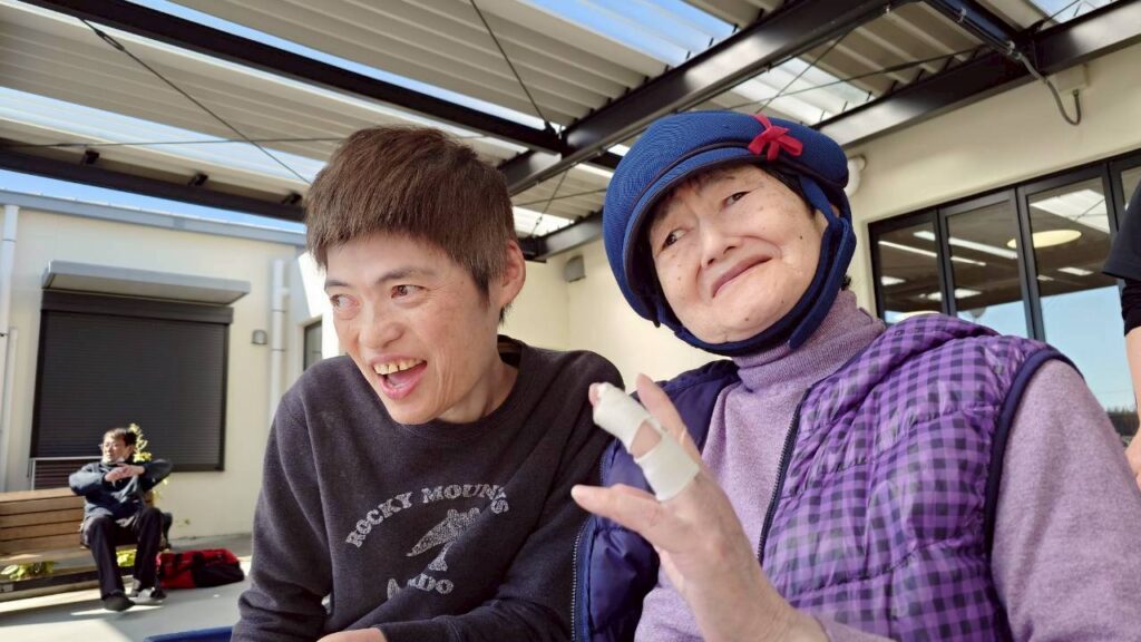 2月13日は、ぽかぽか陽気。バス車庫にてブルーシートを敷いて、ベンチを用意して、日向ぼっこ、外気浴を楽しみました。 素敵な笑顔ですね 平行して紙漉きはがきなどを…
